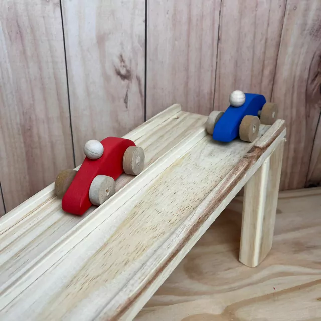 A pista contém 2 carrinhos que descem a pista sozinhos.
